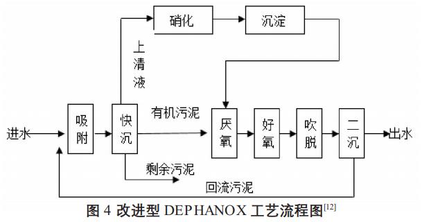 該工藝的原理是反硝化除磷,在理論上進一步強化了氮、磷矛盾的解決,其工藝流程如圖4。污水進入系統(tǒng)后,先與回流污泥混合且吸附大量有機質(zhì),上清液進入獨立的硝化系統(tǒng),下層有機污泥進入?yún)捬鯀^(qū),然后在缺氧區(qū)重新混合,接著進行氮吹脫流入二沉池,最后達標排放。