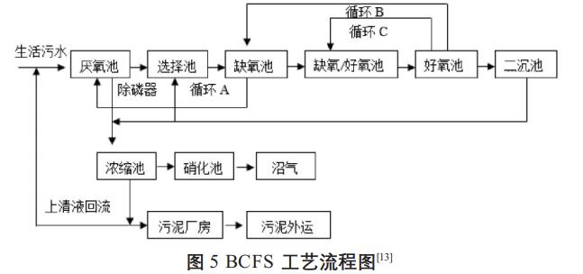 荷蘭Delft大學的Mark教授以氧化溝和UCT工藝為基礎研發(fā)的BCFS工藝是目前已投入使用的單污泥系統(tǒng)。該工藝主要由厭氧池、選擇池、缺氧池等5個主池及3個循環(huán)系統(tǒng)構(gòu)成,其工藝流程見圖5。