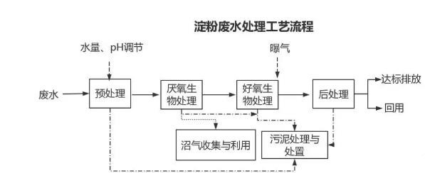 從總體上看,對(duì)淀粉廢水的治理宜采用“預(yù)處理+厭氧生物處理+好氧生物處理+深度處理”的污染治理工藝,工藝流程圖如下: